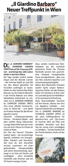Im Mittelpunkt steht der Aperitivo: Allen voran der erfrischende Chandon Garden Spritz, der mit Schaumwein, Orange und feinen Kräutern sommerliche Leichtigkeit ins Glas bringt. Ergänzt wird das Angebot durch kreative Signature-Drinks wie Lavendel- oder Himbeer-Rose-Spritz-Variationen – perfekt für lange After-Work-Abende.