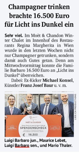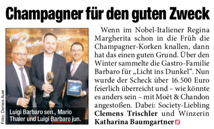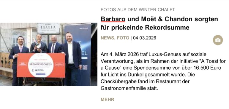 Familie Barbaro sammelte in ihren Restaurants Regina Margherita und Trattoria Martinelli gemeinsam mit Moet & Chandon im Rahmen einer Charity-Aktion unter dem Motto „A Toast for a Cause“ erneut Spenden für „Licht ins Dunkel“. Dabei floss seit mittlerweile acht Jahren ein Teil der Einnahmen aus jedem Glas Moët-Champagner an den guten Zweck. Auch heuer beteiligten sich die Gäste im Winter Chalet automatisch durch ihren Konsum. So kamen diesmal 16.500 Euro zusammen, insgesamt bereits rund 160.000 Euro. Vertreter des Restaurants und von Moët Hennessy betonten die Bedeutung der Hilfe für Menschen in schwierigen Lebenssituationen.